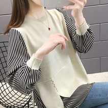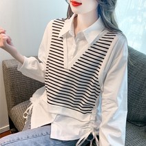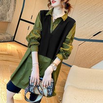 besteffie 봄 가을 여성 레이어드 블라우스 라운드 배색 루즈핏 빅사이즈 긴팔 셔츠 상의 캐주얼 M~3XL A86